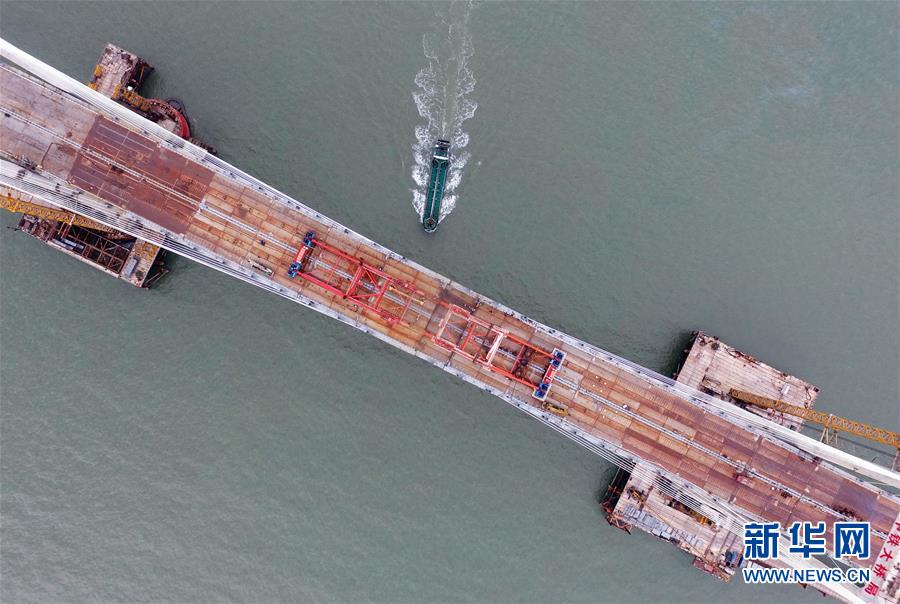 9月21日,平潭海峽公鐵大橋鼓嶼門航道橋的鋼桁梁在吊裝中(無人機(jī)拍攝)。新華社記者林善傳攝