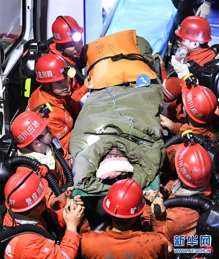 12月18日,救援人員轉(zhuǎn)運(yùn)安全升井的被困人員。 當(dāng)日7時(shí)56分,經(jīng)過80多個(gè)小時(shí)的緊張救援,發(fā)生透水事故的川煤集團(tuán)杉木樹煤礦13名被困人員全部安全升井。 新華社記者 薛玉斌 攝