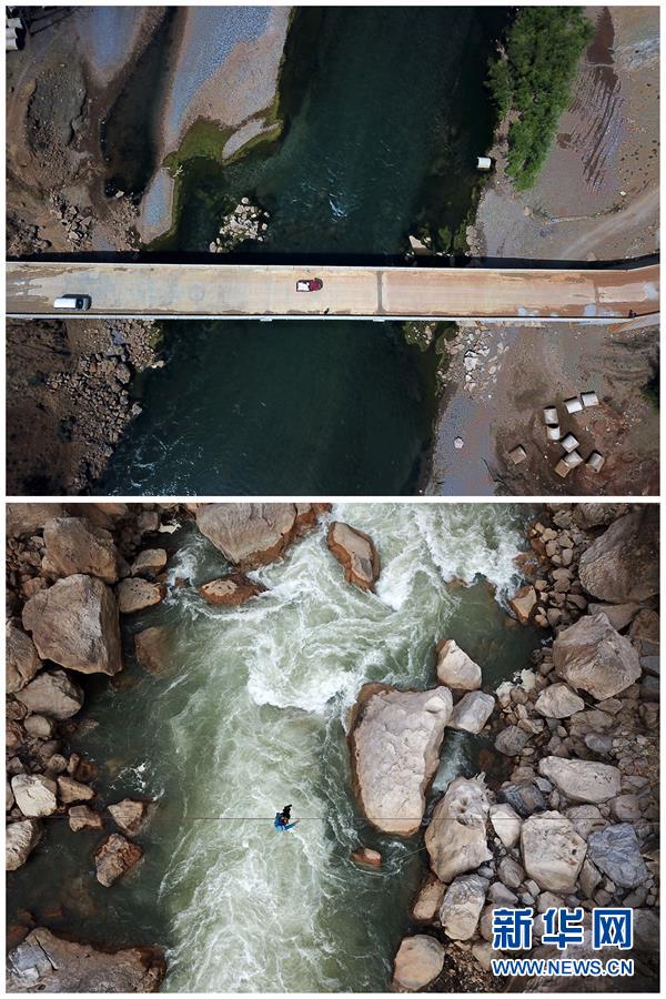 拼版照片:上圖為貴州省威寧縣海拉鎮(zhèn)海元村“溜索改橋”后的場(chǎng)景(2018年3月12日無(wú)人機(jī)拍攝);下圖為貴州省威寧縣海拉鎮(zhèn)花果村的村民利用尚未拆除的溜索過(guò)江(2018年3月12日無(wú)人機(jī)拍攝)。