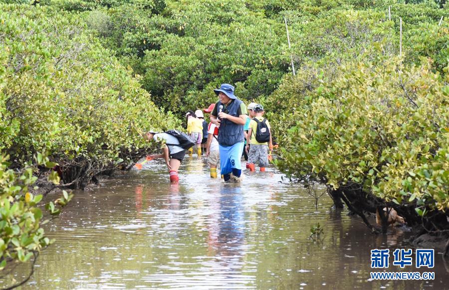海南東寨港國(guó)家級(jí)自然保護(hù)區(qū)林業(yè)工程師馮爾輝(前)在保護(hù)區(qū)內(nèi)為學(xué)生進(jìn)行講解(7月16日攝)。 馮爾輝2009年大學(xué)畢業(yè)后來(lái)到保護(hù)區(qū)工作,小時(shí)候他家就住在紅樹(shù)林邊上,他從小和紅樹(shù)林打交道,喜歡動(dòng)植物和鳥(niǎo)類(lèi)。外貿(mào)專(zhuān)業(yè)畢業(yè)的他邊工作邊學(xué)習(xí),目前主要從事鳥(niǎo)類(lèi)監(jiān)測(cè)、紅樹(shù)林保育、自然教育等工作?!凹t樹(shù)林看著我長(zhǎng)大”,馮爾輝說(shuō),濕地保護(hù)的工作非常有意義。 新華社發(fā)