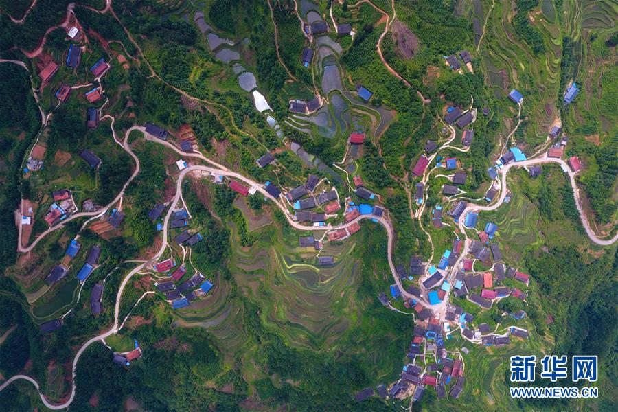 在融水苗族自治縣桿洞鄉(xiāng)黨鳩村下黨鳩屯,道路已經(jīng)修到家家戶戶門前(6月21日無人機拍攝)。新華社記者黃孝邦攝