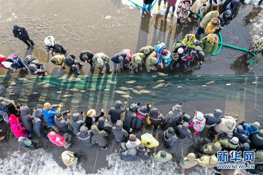 12月18日,人們在諾干湖觀看冬捕活動(無人機拍攝)。新華社記者劉磊攝