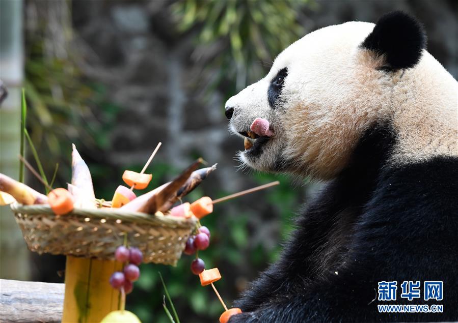 當日是2019年最后一天,海南熱帶野生動植物園的工作人員為園區(qū)內大熊貓“貢貢”“舜舜”準備了用葡萄、南瓜、竹筍等果蔬制作的“火鍋串串香”,讓它們用“擼串”的方式迎接新年的到來。 新華社記者 楊冠宇 攝