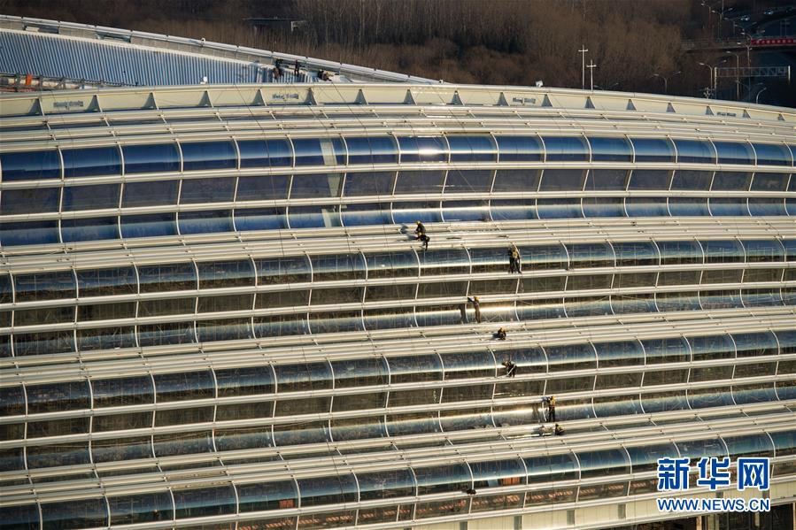 12月31日,施工人員在實現(xiàn)封頂封圍的國家速滑館現(xiàn)場工作。新華社記者鞠煥宗攝
