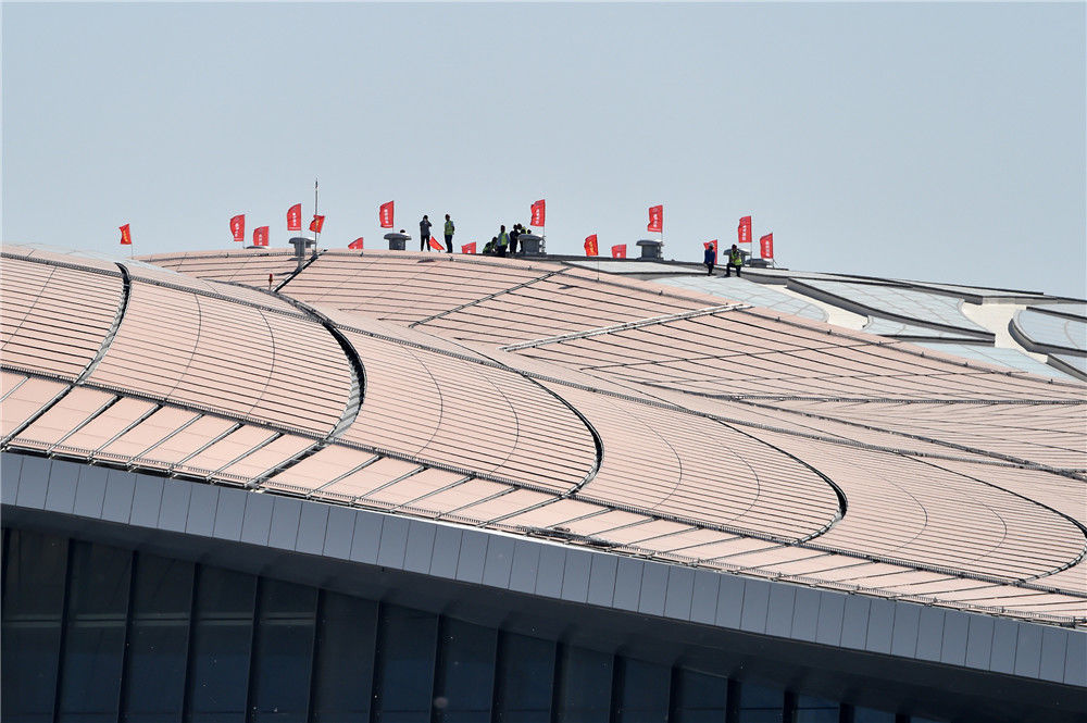 2018年12月19日,北京大興國際機場航站樓的屋面已基本完工,一只金色“鳳凰”完整地出現(xiàn)在北京城南。視覺中國