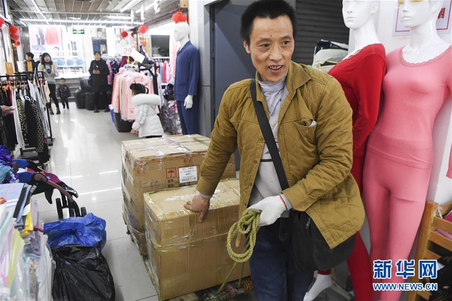 冉光輝在重慶朝天門(mén)大正商場(chǎng)內(nèi)搬運(yùn)貨物(1月5日攝)。新華社記者王全超攝