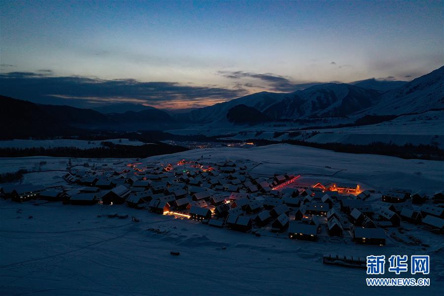 這是2019年12月31日拍攝的傍晚的禾木村(無人機照片)。 在新疆阿勒泰地區(qū)布爾津縣禾木村,不少游客選擇以觀光旅游的方式“別樣跨年”。游客們觀賞雪鄉(xiāng)風景,體驗馬拉爬犁、騎馬等冬游項目,參加篝火狂歡、潑雪迎新年等慶?;顒?,冰天雪地熱情不減,別有一番風情。 新華社記者 宋彥樺 攝