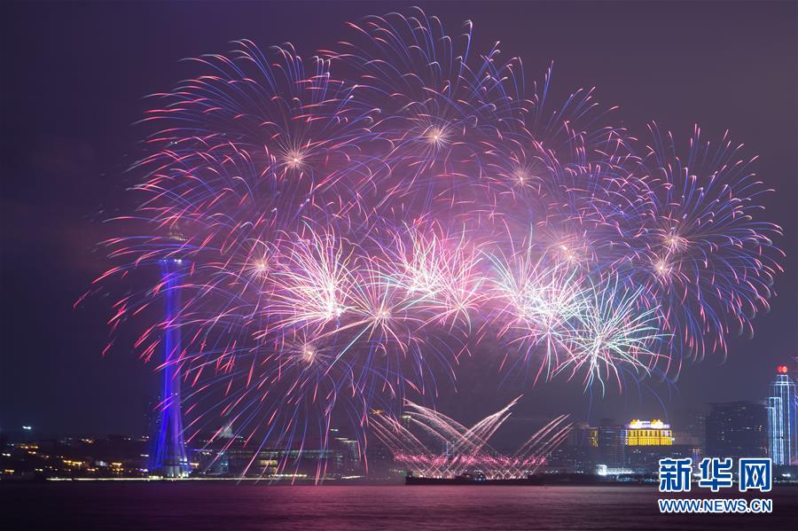 2019年12月31日,澳門特區(qū)在旅游塔對開海面綻放煙花,迎接新一年。 新華社記者 張金加 攝