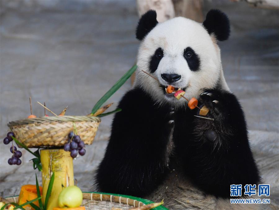 2019年12月31日,大熊貓“貢貢”在“擼串”。 當日是2019年最后一天,海南熱帶野生動植物園的工作人員為園區(qū)內(nèi)大熊貓“貢貢”“舜舜”準備了用葡萄、南瓜、竹筍等果蔬制作的“火鍋串串香”,讓它們用“擼串”的方式迎接新年的到來。 新華社記者 楊冠宇 攝