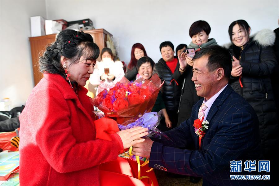 在和順縣李陽鎮(zhèn)南李陽村,新郎馬愛明將花送給新娘溫麗芳(2019年12月31日攝)。 農(nóng)歷臘月初六,是山西省和順縣李陽鎮(zhèn)下石勒村45歲的馬愛明娶媳婦的日子。 地處太行山區(qū)的下石勒村曾深陷貧困,“地下無資源、地上沒產(chǎn)業(yè)”是這里的真實寫照。2013年,村里638口人中有511口屬貧困人口。村民在貧瘠的坡地上種的玉米、谷子等僅夠糊口,外村女子都不愿嫁到這里。和村里多數(shù)人一樣,貧困戶馬愛明不得不在農(nóng)閑時出去打工補貼家用。東走走、西走走,馬愛明沒攢下錢,也沒遇見合適的人,婚事一拖再拖,成了大齡“光棍”。 2013年以來,在國家強有力的政策幫扶和基層黨組織的帶領下,下石勒村以合作社的形式發(fā)展起肉牛養(yǎng)殖、雙孢菇種植、萬壽菊種植等集體產(chǎn)業(yè)。下石勒村經(jīng)濟有了起色,外出打工的村民紛紛回村。馬愛明加入了村里的建筑隊,閑時還到種植專業(yè)合作社打工,一年四季都有活干。加上土地流轉(zhuǎn)的收入,馬愛明一年能收入三萬多元。2016年,下石勒村實現(xiàn)整村脫貧。 2019年,馬愛明結(jié)識了在下石勒村肉雞養(yǎng)殖專業(yè)合作社打工的李陽鎮(zhèn)南李陽村村民溫麗芳,馬愛明的樸實、善良、勤勞打動了溫麗芳,兩人擦出了愛情的火花。 臘月初六這天,下石勒村鑼鼓喧天,嗩吶齊鳴。在鄉(xiāng)親們的見證下,馬愛明手牽新娘,大聲宣布:“我脫單了!我的幸福生活開始了!” 新華社記者 詹彥 攝
