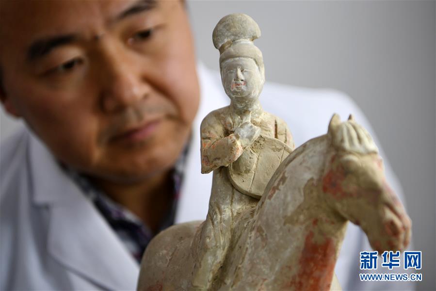 2019年12月27日,在天水市博物館文物保護修復中心陶、玉石器文物修復室,專業(yè)技術(shù)人員孟旭輝在觀察一件唐代彩繪陶俑的病害情況。 甘肅省天水市博物館文物保護修復中心有一支專業(yè)的文物修復隊伍,共有14名專業(yè)技術(shù)人員。從2012年正式成立以來,他們不僅承擔著對館藏和館外文物的修復工作,還參與了多次文化遺存的調(diào)查和搶救性發(fā)掘、古建筑彩畫保護、古墓葬搬遷復原等工作。一件件殘缺破損、滿身病害的文物經(jīng)過他們的巧手修復,又重新煥發(fā)光彩,展示在公眾面前。 新華社記者 馬寧 攝