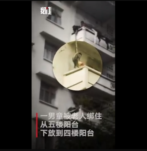 一只貓跑到了百順街老百貨公司宿舍樓三樓的窗戶遮雨臺(tái)上,被5樓的老太太發(fā)現(xiàn),老太太善心發(fā)作,竟將孫子用繩子吊起,從5樓慢慢放至3樓救貓,整個(gè)過程不禁令人捏汗。