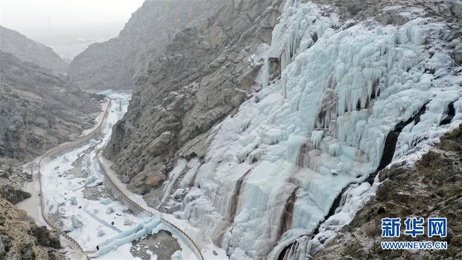 這是1月7日拍攝的賀蘭山巖畫景區(qū)內的冰瀑景觀(無人機照片)。 新華社記者 王鵬 攝