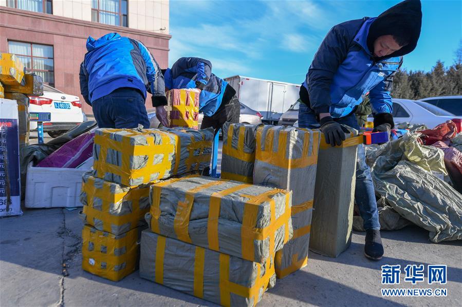 12月27日,在吉林松原查干湖漁場,快遞員將魚打包準(zhǔn)備發(fā)給客戶。新華社記者張楠攝