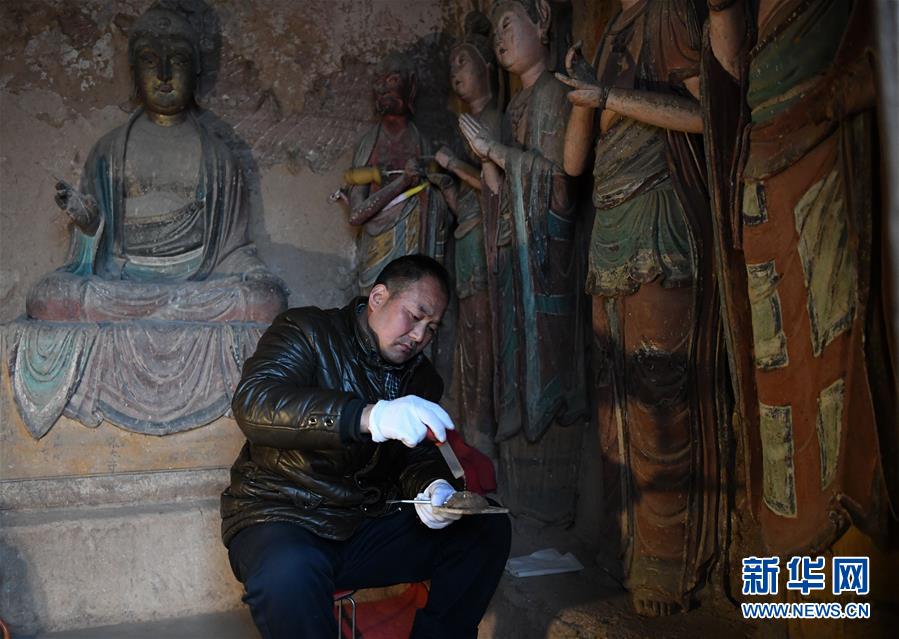 12月25日,在麥積山石窟第11窟,修復(fù)師牟常有在和泥,準(zhǔn)備修復(fù)塑像。新華社記者馬寧攝