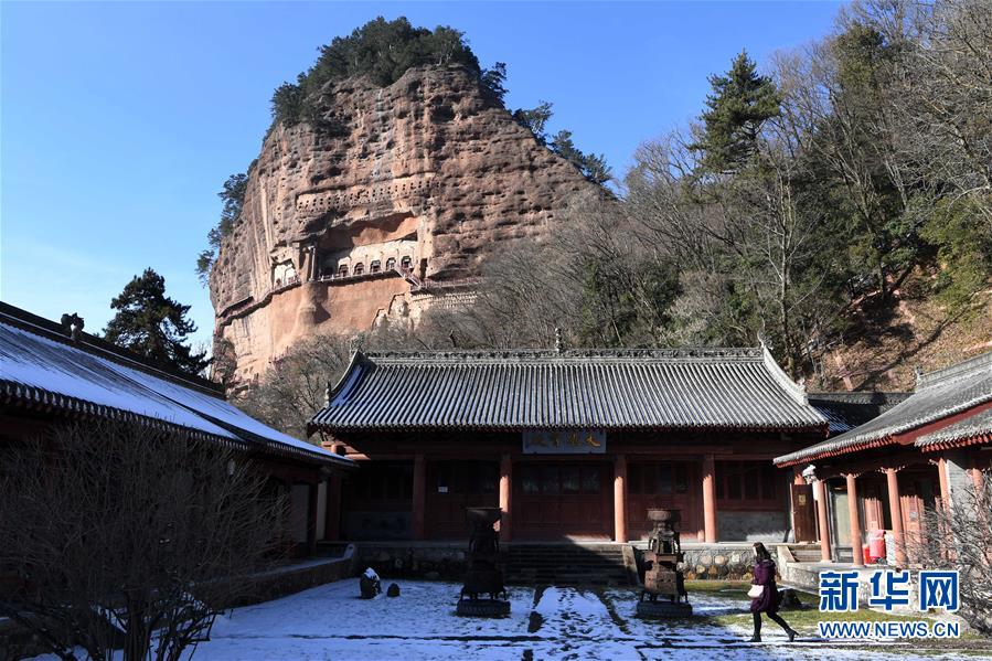 12月26日,游客在麥積山石窟參觀游覽。一場降雪過后,位于甘肅省天水市的麥積山石窟在晴空下尤為壯美。麥積山石窟是中國四大石窟之一,因其山形似麥垛而得名,現(xiàn)存窟龕221座。新華社記者馬寧攝