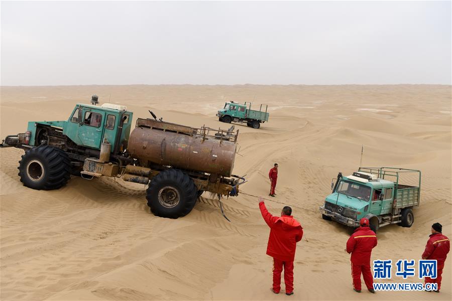 一輛測(cè)量作業(yè)車陷在沙坑中,水罐車進(jìn)行營(yíng)救(1月13日攝)。地球物理勘探是油氣開發(fā)的第一步,相當(dāng)于給地球做CT。物探工人按照嚴(yán)格的測(cè)線部署,在相應(yīng)位置鉆井,然后實(shí)施地震,采集地震波數(shù)據(jù)。科研人員通過數(shù)據(jù)組成的“CT片”,就能夠清晰地“看”到地下的地質(zhì)結(jié)構(gòu),判斷哪里埋藏有石油或者天然氣。2019年10月,東方地球物理勘探有限責(zé)任公司塔里木物探處2113隊(duì)進(jìn)入新疆塔克拉瑪干沙漠腹地,開始中古14-21、塔中2兩個(gè)區(qū)塊的三維地震勘探。近2000名物探工人將在1000平方公里的范圍內(nèi)一直工作到2020年4月,這也意味著他們將在塔克拉瑪干沙漠腹地連續(xù)度過第14個(gè)除夕夜。蘊(yùn)藏著豐富石油天然氣資源的新疆塔克拉瑪干沙漠有“死亡之海”之稱,氣候干燥,年降水量在50毫米以下,冬季地表最低溫度超過零下30攝氏度,是世界油氣勘探難度最大的地區(qū)之一。為避開風(fēng)季,物探工人每年9、10月份進(jìn)入沙漠,一直工作到來年4月,夜以繼日與黃沙、嚴(yán)寒為伴,用辛勤的汗水,為祖國(guó)找油找氣。新華社記者丁磊攝