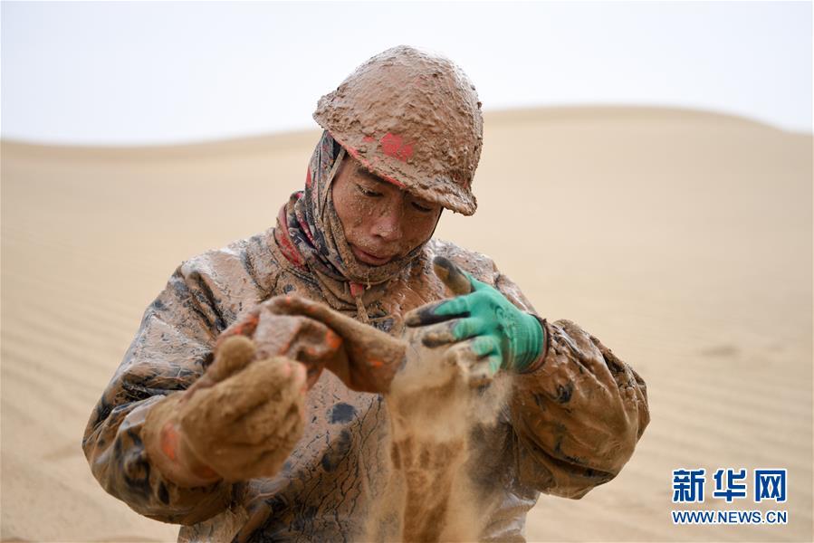 1月13日,鉆井工潘洪星用沙子帶出手套里的泥水。地球物理勘探是油氣開發(fā)的第一步,相當(dāng)于給地球做CT。物探工人按照嚴(yán)格的測線部署,在相應(yīng)位置鉆井,然后實施地震,采集地震波數(shù)據(jù)??蒲腥藛T通過數(shù)據(jù)組成的“CT片”,就能夠清晰地“看”到地下的地質(zhì)結(jié)構(gòu),判斷哪里埋藏有石油或者天然氣。2019年10月,東方地球物理勘探有限責(zé)任公司塔里木物探處2113隊進入新疆塔克拉瑪干沙漠腹地,開始中古14-21、塔中2兩個區(qū)塊的三維地震勘探。近2000名物探工人將在1000平方公里的范圍內(nèi)一直工作到2020年4月,這也意味著他們將在塔克拉瑪干沙漠腹地連續(xù)度過第14個除夕夜。蘊藏著豐富石油天然氣資源的新疆塔克拉瑪干沙漠有“死亡之海”之稱,氣候干燥,年降水量在50毫米以下,冬季地表最低溫度超過零下30攝氏度,是世界油氣勘探難度最大的地區(qū)之一。為避開風(fēng)季,物探工人每年9、10月份進入沙漠,一直工作到來年4月,夜以繼日與黃沙、嚴(yán)寒為伴,用辛勤的汗水,為祖國找油找氣。新華社記者丁磊攝