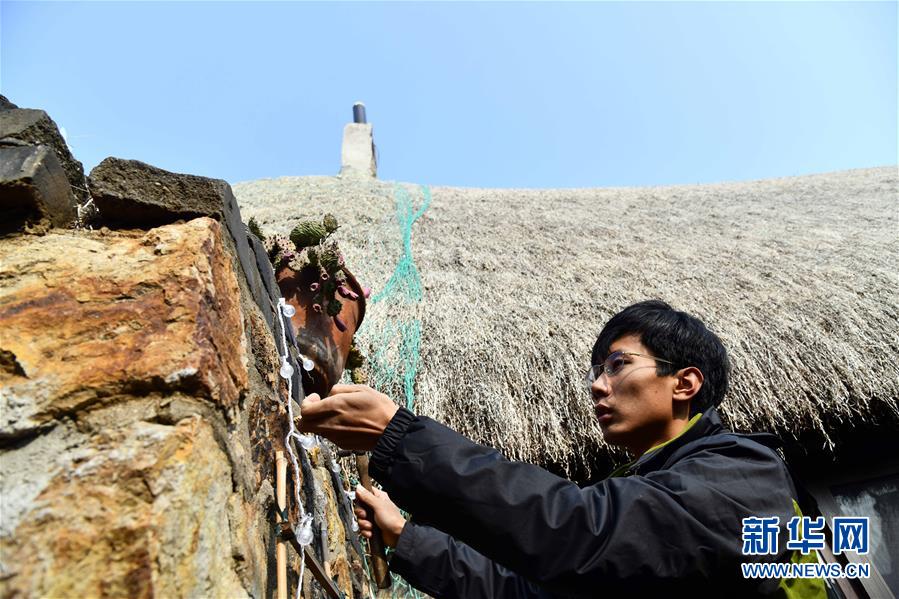在榮成市煙墩角村,于海洋為海草民宿掛彩燈(1月12日攝)。新華社記者 隋先凱 攝
