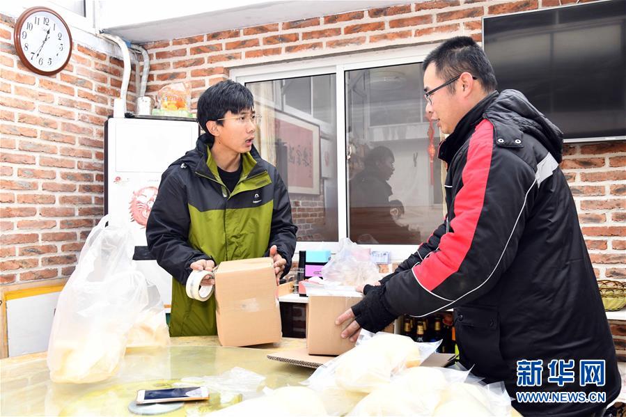在榮成市煙墩角村,于海洋(左)與前來收貨的快遞小哥交談(1月12日攝)。新華社記者 王凱 攝