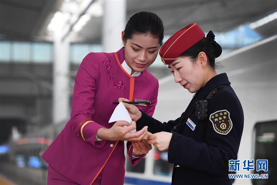 吉如(左)將盲人旅客吳瀟護送上車后,與列車長進行交接(1月15日攝)。 新華社記者 陶明 攝