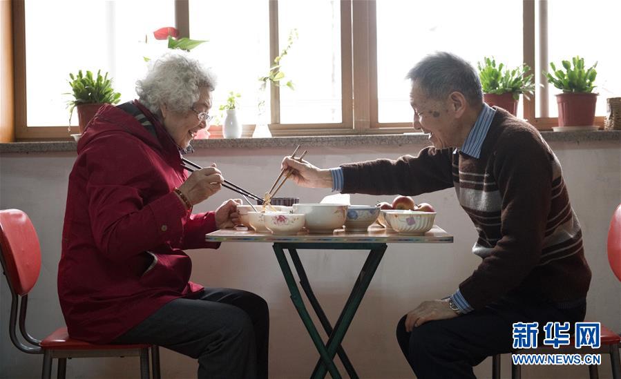 1月17日,王育華(左)和丈夫李偉光在杭州市社會福利中心宿舍吃午飯。新華社記者 翁忻旸 攝