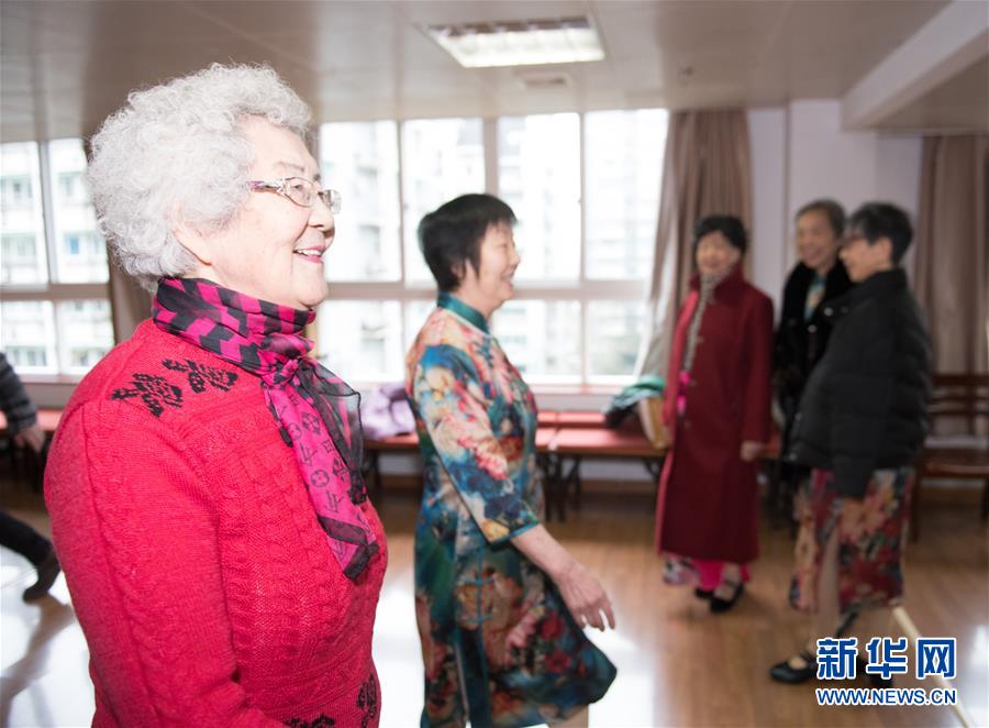 1月17日,王育華(前)向杭州市社會(huì)福利中心模特隊(duì)的一名隊(duì)員學(xué)習(xí)走臺(tái)步。新華社記者 翁忻旸 攝