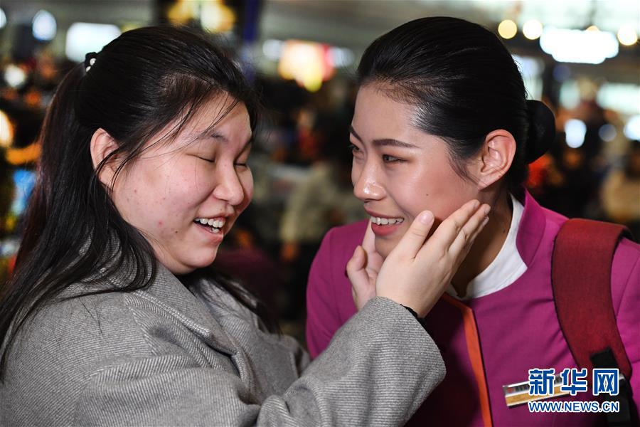 盲人姑娘吳瀟(左)從西安北站中轉(zhuǎn)回延安老家,得到吉如的溫馨服務(wù)。臨別時,吳瀟激動地說:“小姐姐,你的服務(wù)太貼心了,我看不見你,能摸摸你的臉頰嗎?”(1月15日攝)。新華社記者陶明攝