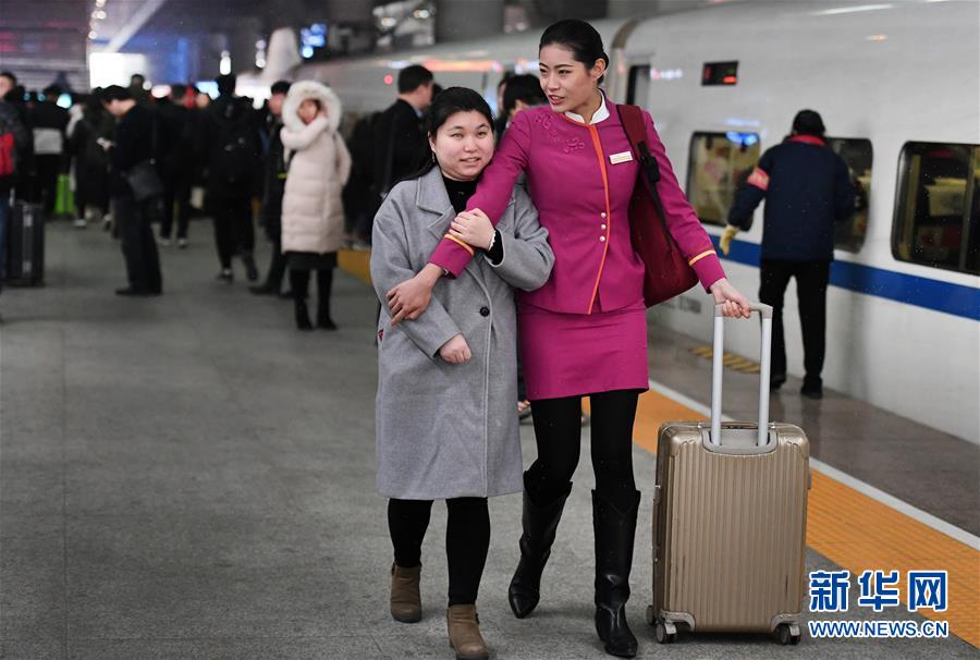吉如(前右)護(hù)送盲人姑娘吳瀟上車(chē)(1月15日攝)。新華社記者陶明攝