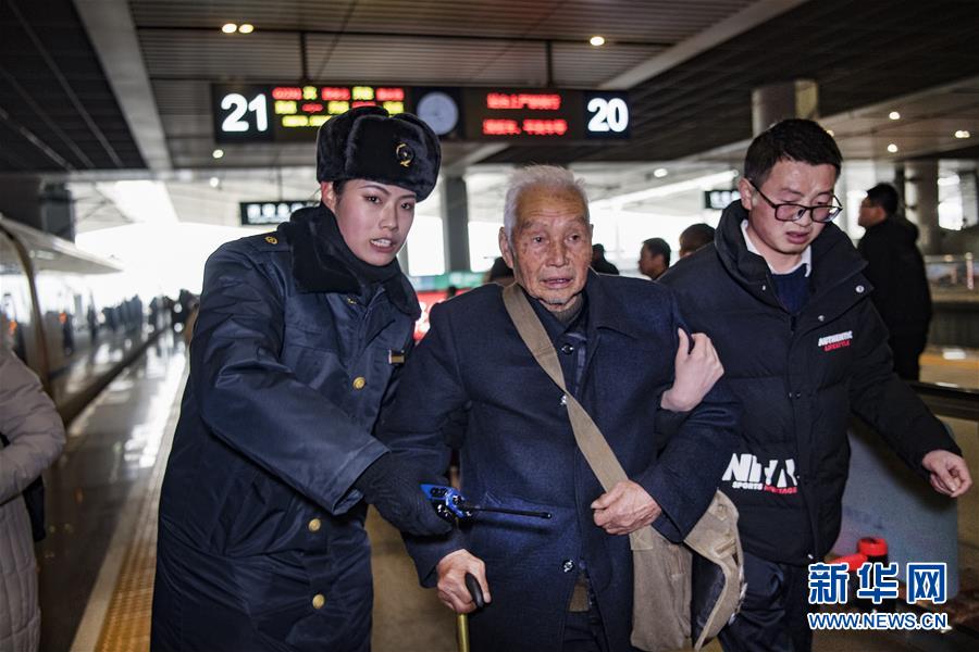 吉如(左一)在西安北站的站臺(tái)上協(xié)助旅客乘降,確保旅客安全乘車(1月14日攝)。今年春運(yùn)列車開(kāi)行密度大,站臺(tái)崗位人員緊張,吉如時(shí)常被調(diào)到站臺(tái)進(jìn)行站臺(tái)服務(wù)工作。新華社記者陶明攝