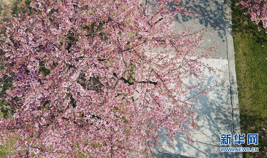 這是2月24日在上海松江辰山植物園內(nèi)拍攝的河津櫻(無人機照片)。 新華社記者 方喆 攝