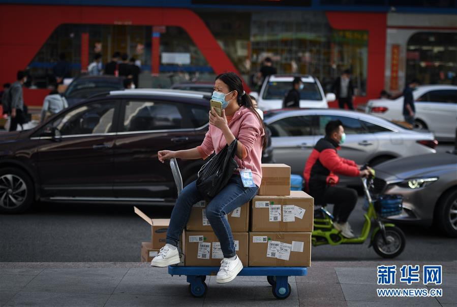 2月24日,在深圳華強(qiáng)北街頭,人們帶著口罩搬運(yùn)貨物。 新華社記者 毛思倩 攝