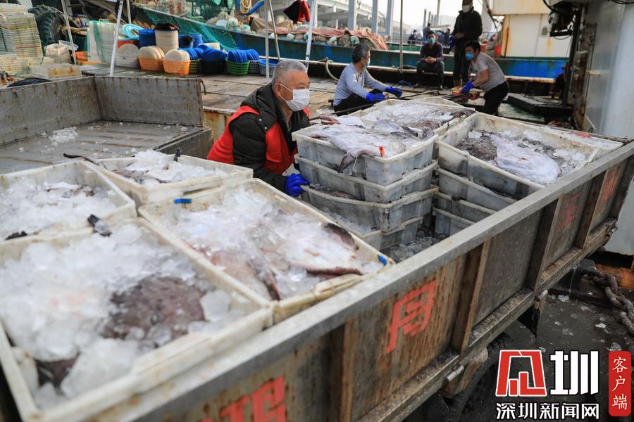 2020年2月24日,浙江舟山國際水產(chǎn)城碼頭,當(dāng)?shù)氐墓と苏趧偪堪兜臐O船上卸魚貨,現(xiàn)場十分繁忙。