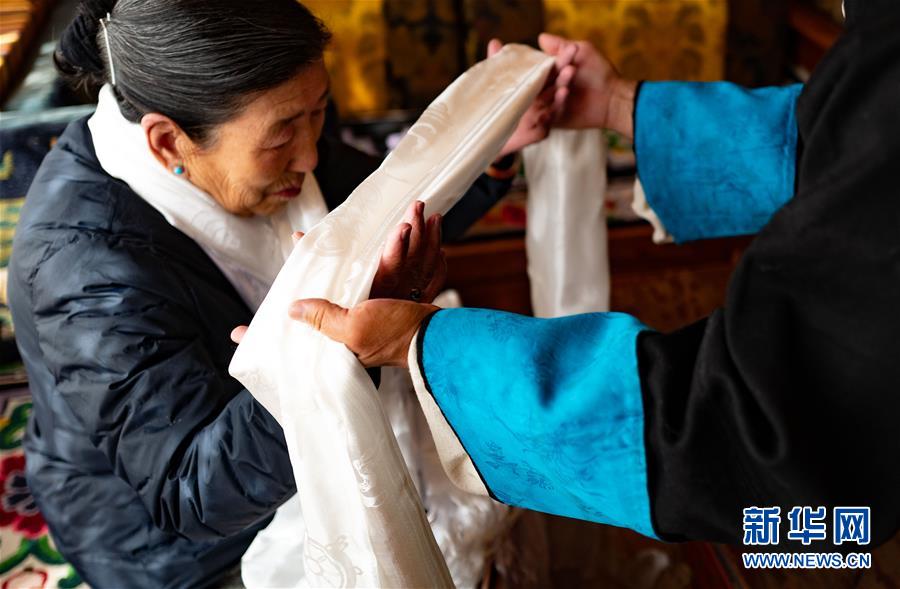 一名藏族群眾給長(zhǎng)輩敬獻(xiàn)哈達(dá),祝福長(zhǎng)壽(2月24日攝)。新華社記者普布扎西攝