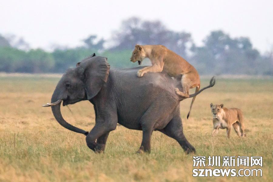英國攝影師詹姆斯(James Gifford)在博茨瓦納喬貝國家公園拍到一群獅子獵食大象的精彩畫面。在詹姆斯的鏡頭下,一頭母獅跳到了一頭小象的背上想要將其拿下,但僅憑一己之力又不能做到。但當(dāng)母獅的后援抵達時,象群也趕到了現(xiàn)場。最終,小象回到了象群中獲得庇護,而獅群也不得不悻悻離去。