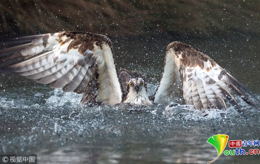 一只魚鷹潛入湖中捉鱒魚,激起巨大的水花。