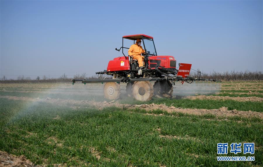 3月4日,建建農(nóng)機合作社社員在蒲城縣椿林鎮(zhèn)平峨村駕駛自走式高桿噴霧機為小麥噴灑除草殺菌劑。近日,為確保疫情期間不誤農(nóng)時,陜西省蒲城縣植保植檢站組織縣內(nèi)7家農(nóng)作物病蟲害專業(yè)化防治單位,在小麥返青起身期,對麥田進行除草及病蟲害的防控工作。新華社記者李一博攝