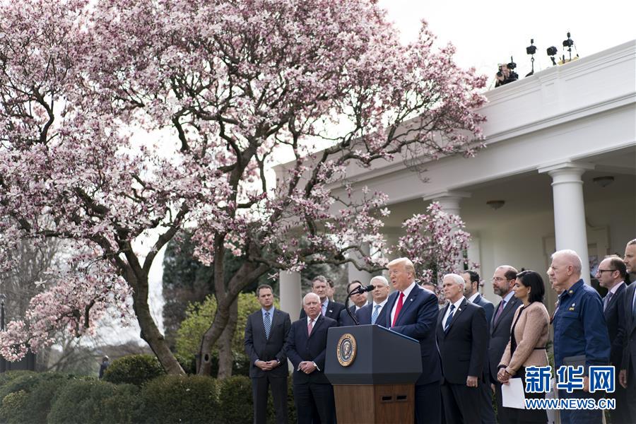 3月13日,美國總統(tǒng)特朗普(前)在華盛頓白宮的記者會(huì)上講話。特朗普當(dāng)天下午在白宮發(fā)表講話時(shí)正式宣布“國家緊急狀態(tài)”。他說,此舉旨在讓美國聯(lián)邦政府全力投入到抗擊新冠肺炎疫情的努力中。這項(xiàng)舉措將釋放500億美元資金,幫助各州和地方政府應(yīng)對疫情。新華社記者劉杰攝