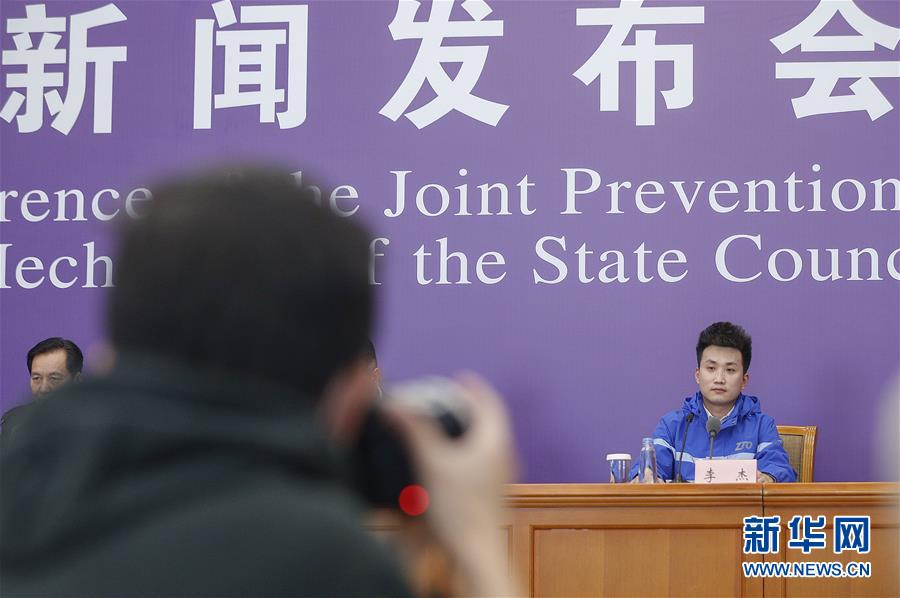 3月9日,中通快遞北京廠洼路網(wǎng)點快遞員李杰在北京出席國務(wù)院聯(lián)防聯(lián)控機制新聞發(fā)布會。新華社記者張玉薇攝