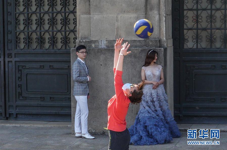 3月15日,在南京東郊體育公園,一對(duì)新人在一名練習(xí)排球的市民旁拍攝婚紗照。 當(dāng)日,南京風(fēng)和日麗,市民們來到東郊體育公園,踏青春游。 新華社記者 楊磊 攝