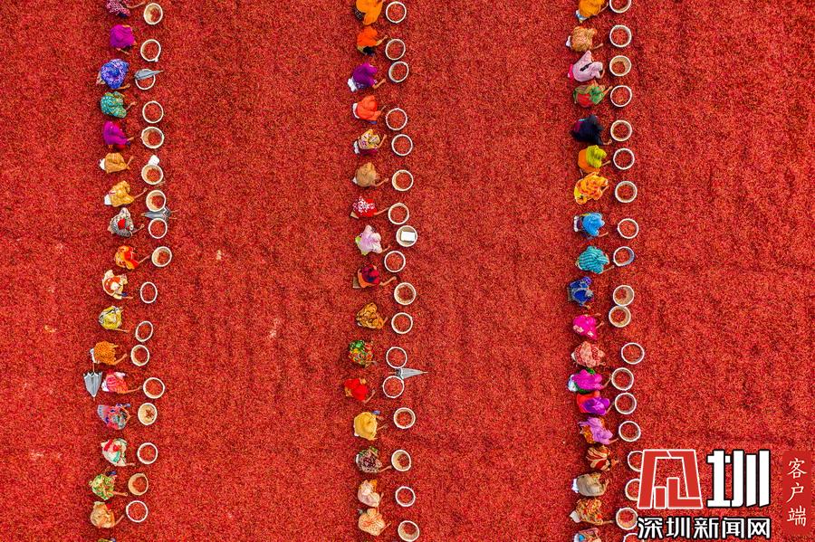 航拍孟加拉國工人分揀辣椒 滿眼火紅大地如鋪上地毯