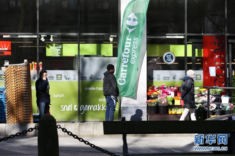 3月18日,顧客在比利時布魯塞爾的一家商店排隊購物。 新華社記者 潘革平 攝