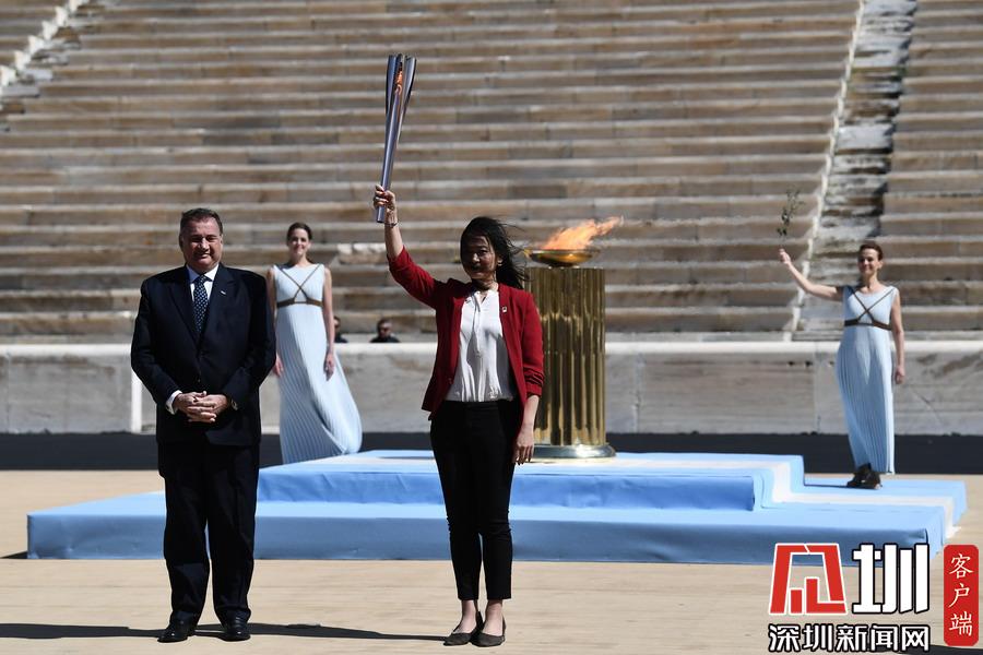 3月19日,日本代表團(tuán)成員井本直步子(右)從希臘奧委會(huì)主席斯皮羅斯·卡普拉洛斯手中接過(guò)東京奧運(yùn)會(huì)圣火火炬。