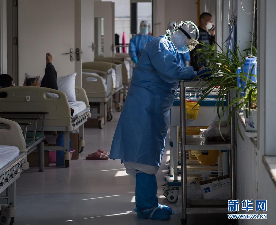 3月19日,在武漢市肺科醫(yī)院隔離病房,內(nèi)蒙古醫(yī)療隊隊員陳亮在現(xiàn)場忙碌。 新華社記者 肖藝九 攝