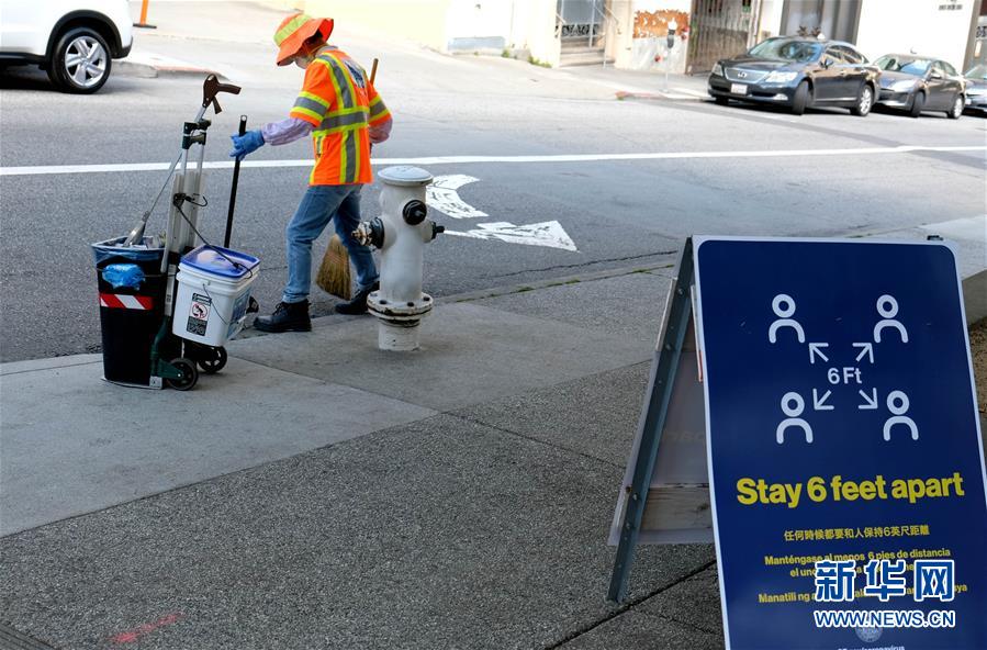 3月20日,一名清潔工在美國(guó)加利福尼亞州舊金山唐人街打掃衛(wèi)生。 新華社記者吳曉凌攝