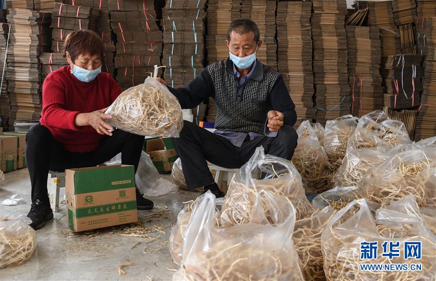 湖北當陽市壩陵辦事處群華村村民宋發(fā)林(右)和妻子在農產品合作社包裝產品,準備通過電商外銷(3月21日攝)。近日,湖北當陽市農業(yè)生產和農產品加工加速恢復。截至3月19日,當陽市86家規(guī)上農產品加工企業(yè)復工復產率為84.9%,51家農業(yè)產業(yè)化重點龍頭企業(yè)有48家復工復產,占比達94.1%。新華社記者程敏攝