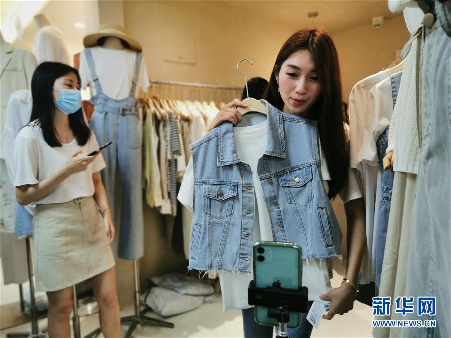 在廣州市新中國大廈內(nèi),一家服裝檔口的員工在用手機(jī)進(jìn)行直播(3月21日攝)。新華社記者胡林果攝