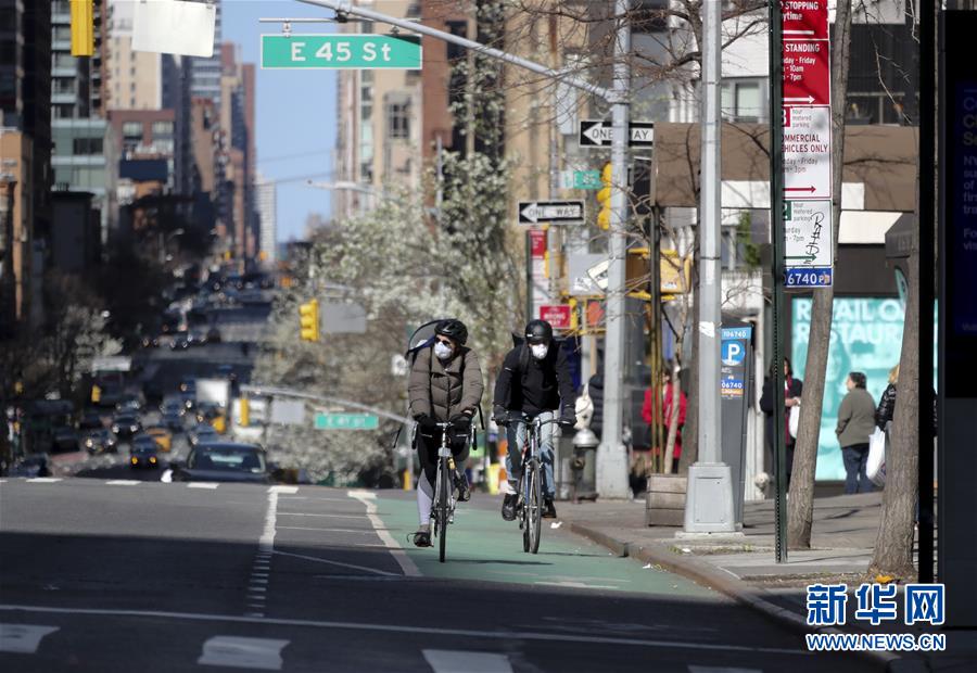 3月21日,在美國紐約第二大道,人們戴口罩騎車出行。美國紐約州、伊利諾伊州、康涅狄格州20日發(fā)布針對本州居民的“居家令”,以遏制新冠病毒傳播。這些“居家令”涵蓋紐約、洛杉磯、芝加哥等大城市,影響數(shù)千萬人。白宮20日發(fā)表聲明說,總統(tǒng)特朗普已宣布紐約州出現(xiàn)“重大災難”,命令聯(lián)邦政府支援該州抗擊新冠肺炎疫情。新華社記者王迎攝