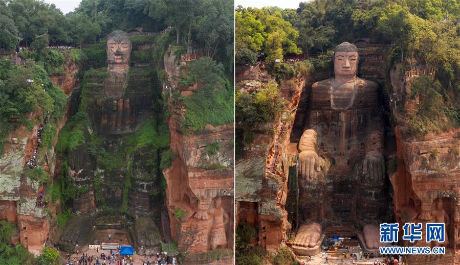這是一張拼版照片:左圖為體檢與搶救性修復工作前的樂山大佛(2018年10月4日無人機拍攝);右圖為體檢與搶救性修復工作后的樂山大佛(3月29日無人機拍攝)。新華社記者江宏景攝