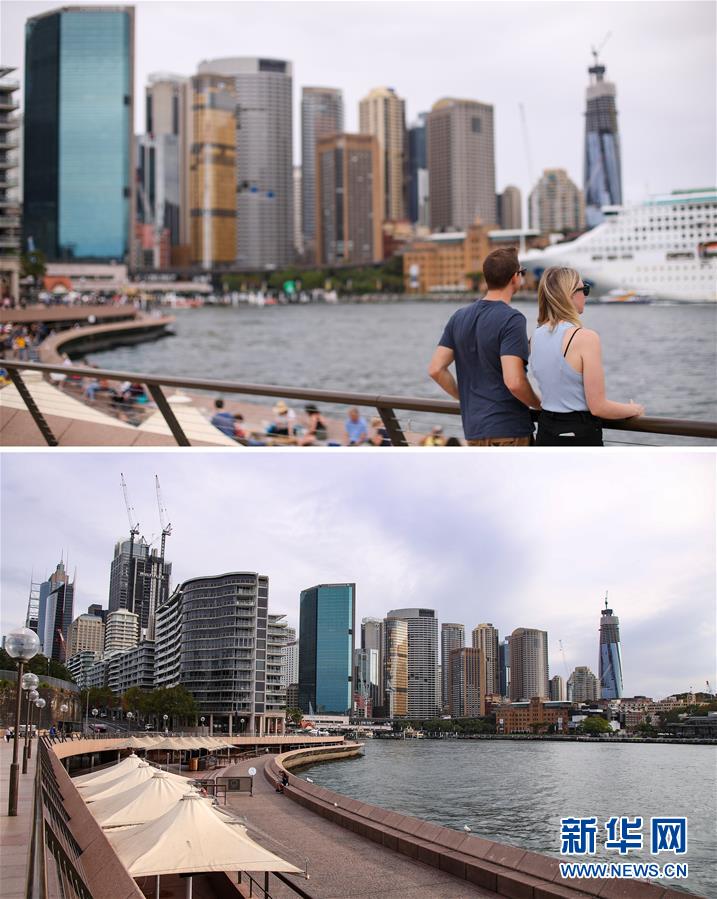 拼版照片顯示:(上)3月10日,人們?cè)诎拇罄麃喯つ岷8鄞髽蚋浇貌汀?(下)3月24日,澳大利亞悉尼海港大橋附近空無(wú)一人。 新華社記者 白雪飛 攝